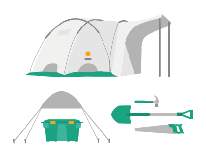 Große, robuste Zelte, die extremen Wetterbedingungen und Temperaturen standhalten können.