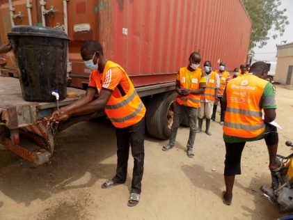 Das IEDA-Team steht an, um sich während der Verteilung von Hilfsgütern in Kamerun die Hände zu waschen. In Partnerschaft mit IEDA Relief haben wir fast 8.000 Familien in Kamerun geholfen.